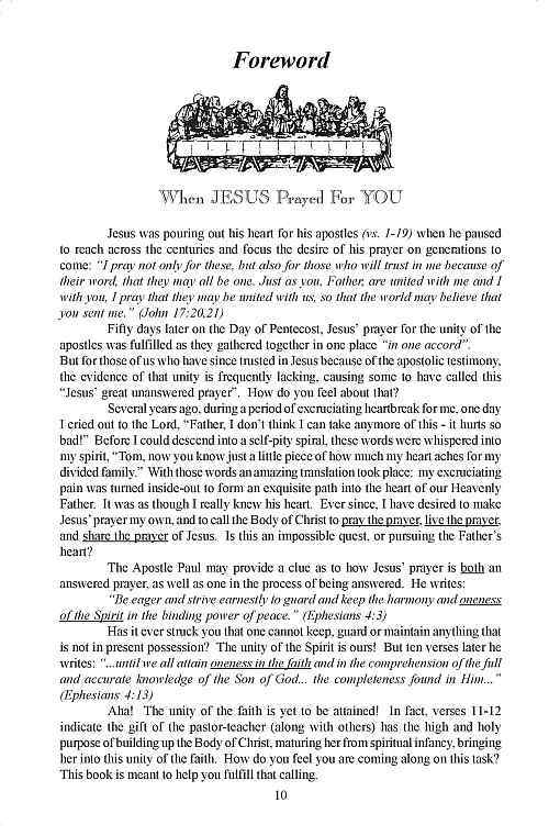 WHOLE CHURCH - Enlist the entire congregation in following together through a time of focused prayer and study on this revelation of our Lord's heart-cry; how making His prayer our own will help usher in greater harmony in our homes, in our church, and in our functioning as the Body of Christ to make the Gospel of Christ known to unreached peoples here and around the world. (29 Days, including a 5 Sunday Sermon Series) - Ask for a plan by e-mail: john17-21@msn.com.