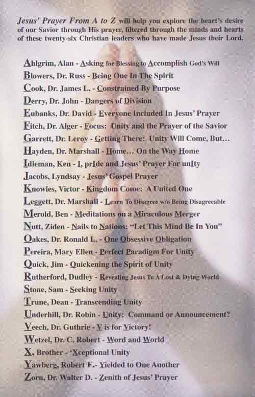 The first credit for this book goes to the One who awakened me at 4 o’clock in the morning with the burning desire to create a devotional book on Jesus’ prayer - from A to Z - with the letters corresponding to the contributing authors’ names.